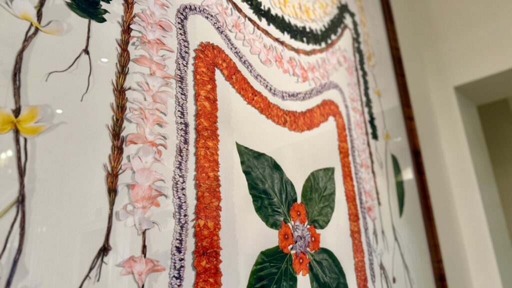 「モアナサーフライダーのバニアンツリーは、1904年から120年以上にわたってこの場所で人々を見守ってきました。ホテルの象徴であるこの木をテーマに、世界中から訪れる旅行者をレイで表現してホテルと人々の物語を表現したのが、フロントの横にある作品。ハワイアンキルトのような正方形ではなく、左右対称の特別なスタイルが特徴なんです。バニアンツリーで編まれたレイや、クラウンフラワーなど高貴な花を贅沢に使った作品。オレンジ色の美しい花は“コウ”の花。ハワイの固有植物で、ふわふわと繊細なのに強くて魅力的な木なんです。実は、今回のプロジェクトに関わって初めて、この木がハワイ固有の植物だと知ったんです。こうやって、新たな発見があることも、コラボレーションの醍醐味ですよね」とクリスティンは語ってくれました。