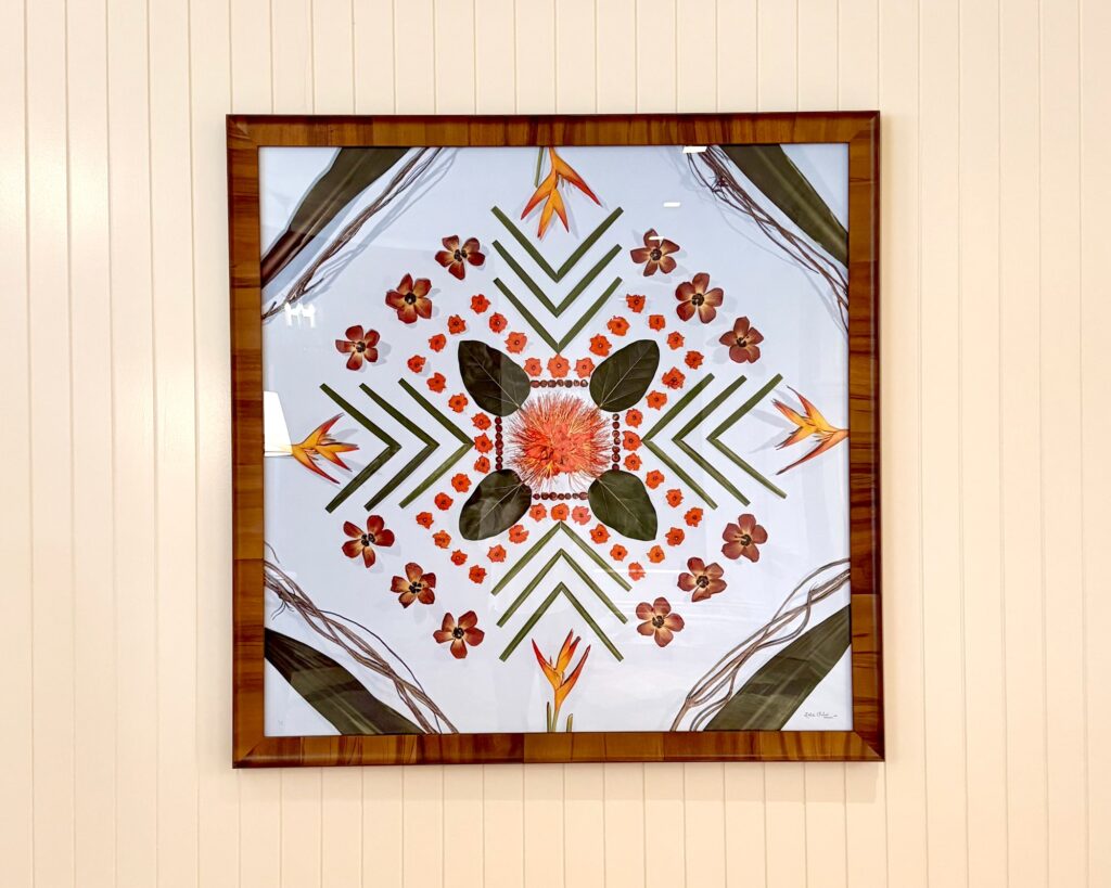 その他、ロビーに2点、彼女の作品が飾られています。こちらもコウの花や木をはじめ様々な美しい花が使われたもの。「ホテルが3つのウィングからなっていること、そして、パワースポットとして知られる、ワイキキビーチの“カパエマフの魔法石(ウィザードストーン)”が4つあることを踏まえて、3と4という数字をデザインに織り込んだのがこだわりなんです」というクリスティン。アートの背景にあるストーリーを知れば知るホと、ますますその魅力が輝いて見えます。