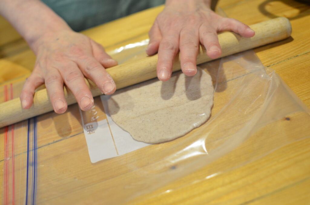 ※生地の広がりが足りない場合は、のし棒などでさらに伸ばす(保存袋からはみ出さないよう注意)。生地が破れない程度に、極力薄くする