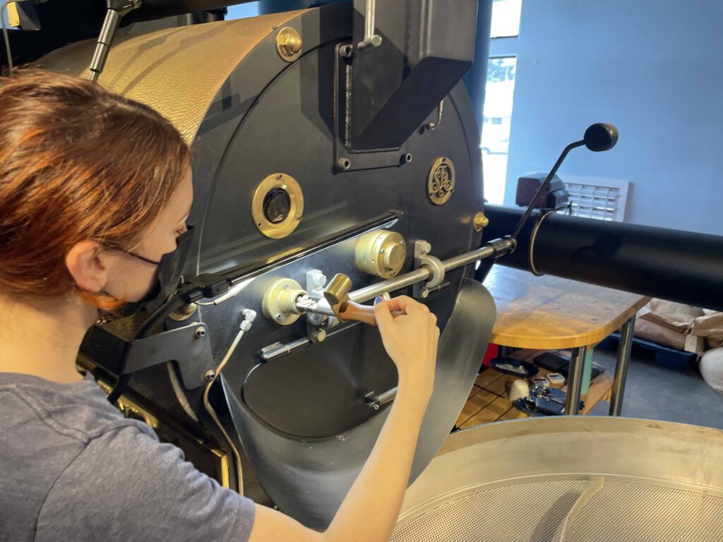 焙煎をする日は毎週ほぼ決まっていて、週の半分は1日中行われています。「機械を動かしたら、ほぼ連続で1日20回くらい焙煎をしています」とローラ。アメリカが誇るサンフランシスカン製の大型焙煎機の近くには、ジュート(黄麻)袋に入ったグリーンコーヒーが保管され、ローラが袋からグリーンコーヒーを取り出して、手際よく作業を行います。