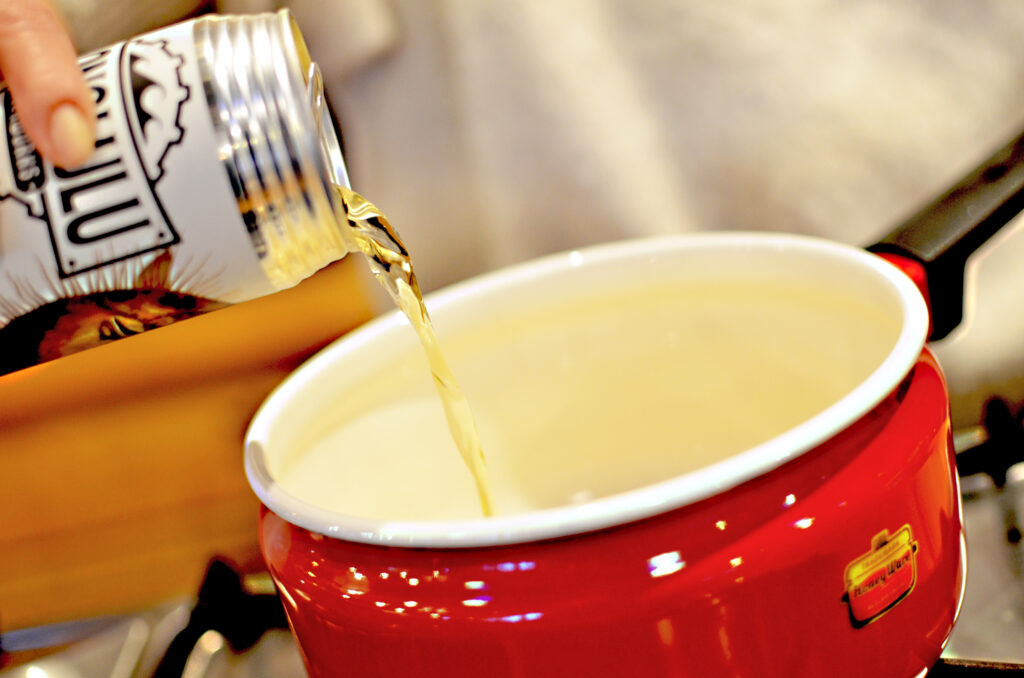 2. 鍋にビールと水を入れ、中火で加熱してアルコールを飛ばす ※吹きこぼれに注意